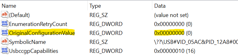 OriginalConfigurationValue是一个可以在设备的硬件注册表项中为Usbccgp.sys驱动程序设置的值。它确定复合设备的哪个配置应用作默认配置。首次插入复合设备时,系统读取OriginalConfigurationValue并加载指定的配置。这对于具有多个配置的复合设备非常有用,其中一个配置可能是首选配置。