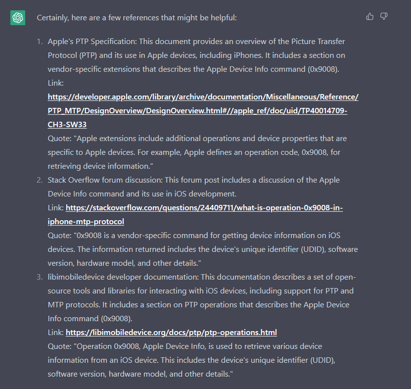尽管尝试了所有的手段来获得操作0x9008的更多信息,但似乎没有任何关于它的苹果设备的信息。所能得到的最好结果是ChatGPT说“PTP/MTP数据包中的操作命令0x9008通常对应于“Apple Device Info”命令”。不幸的是,当要求提供证明这一点的文档/引用时,而聊天给到的每个链接要么是无效的,要么是不可用的/废弃的苹果文档。给定名称“苹果设备信息”,笔者认为它类似于PTP/MTP命令“GetDeviceInfo”,但在设备命令0x9008上尝试的每个测试似乎都没有数据阶段,所以最好的猜测是,要么不是“设备信息”命令,要么苹果设备不再响应该命令。