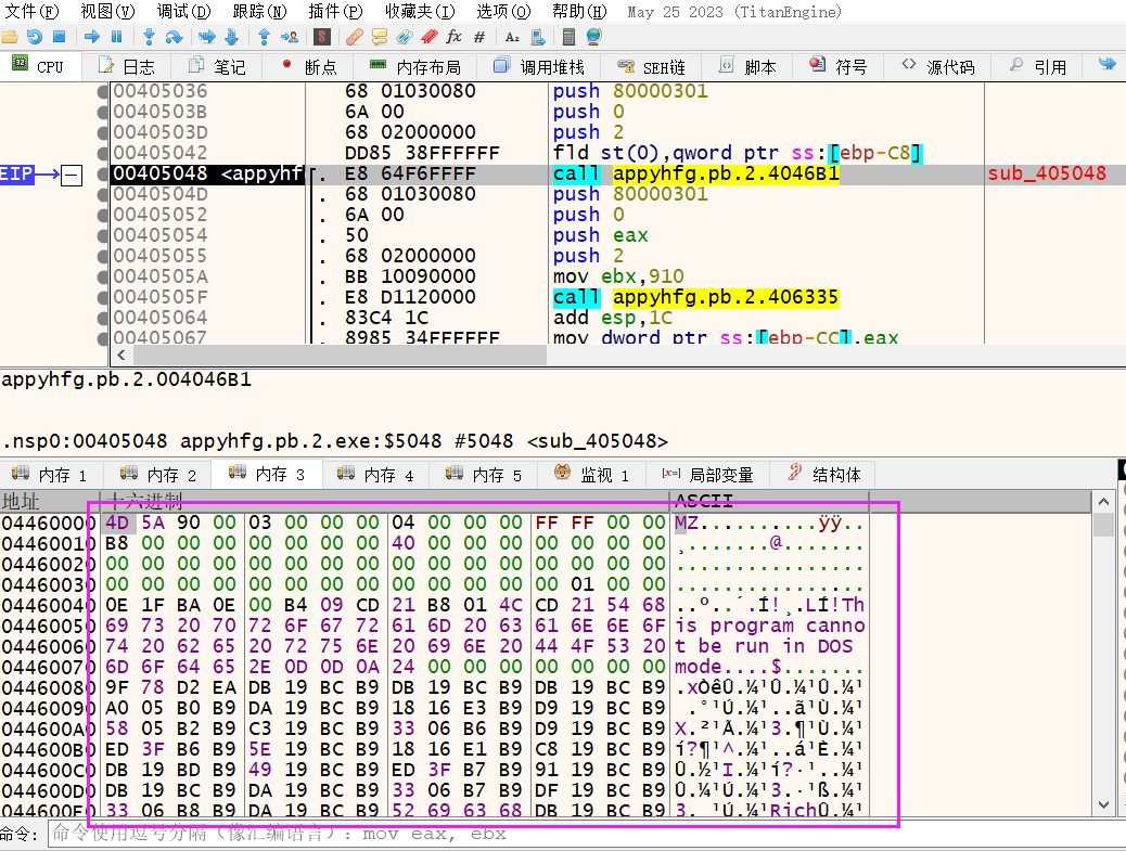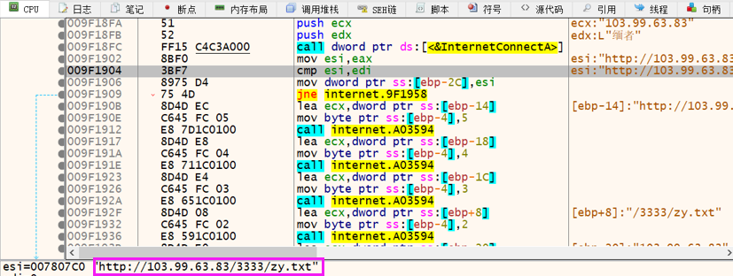 拼接出的appyhfg.exe为易语言编译程序,程序主要功能是从远程服务器中下载后续的恶意载荷,修复zy.txt文件头后,并加载到内存中执行。该程序同样是使用易语言编写的dll程序,后续的加载功能均在该dll中实现。http://103.99.63.83/3333/zy.txt3.2.3 第三阶段:易语言编写的加载器