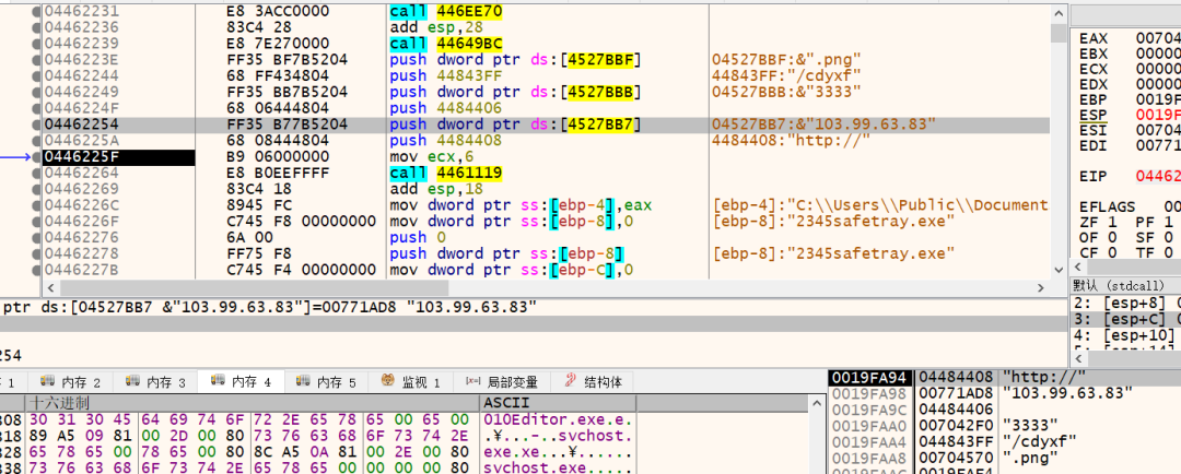 在C:\Users\Public\Documents文档中写入被控主机的唯一标识信息。 从远程服务器中读取后续远控部分到内存中,下载到加密数据后,在内存中解密出完整PE文件。http://103.99.63.83/3333/cdyxf.txt3.2.4 第四阶段:最终载荷FatalRAT木马