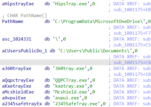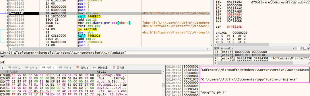 将当前执行程序路径下的易语言支持库复制到"C:\Users\Public\Documents"目录下。通过遍历在磁盘和进程中查找是否存在国内常见杀毒软件,如果不存在则直接将初始载荷复制到路径,并将其写入注册表中实现持久化。C:\Users\Public\Documents\Applicationuhinj.exe 将初始载荷路径写入.lnk文件中并将其放入到开机自启路径下"ajjnm"文件夹,以便于后续实现持久化操作。下载后续远控