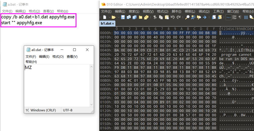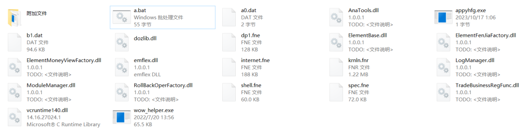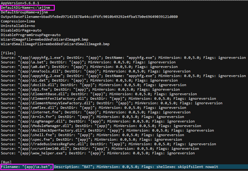 攻击者编译易语言程序时使用非静态编译,必须附带相关支持库才能正常运行,所以通常会使用到“Inno Setup”或者“7zsfx”等打包软件进行打包。双击后将其包含的文件释放到“C:\ajjnm”目录下,包含多个易语言支持库以及恶意代码执行组件。执行其中批处理脚本a.bat,将文件拼接起来组成完整可执行程序。