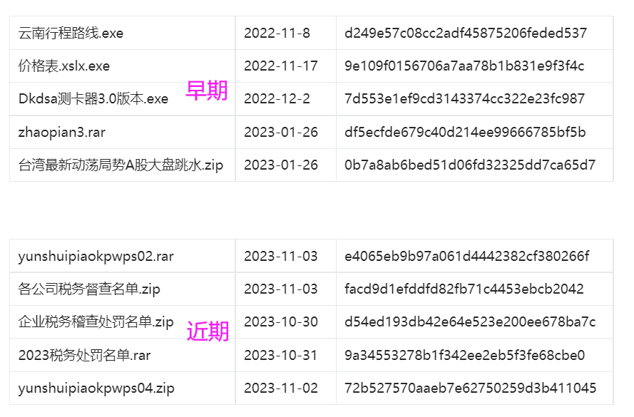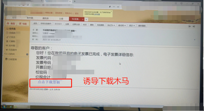 - 近期监测发现,该团伙通过钓鱼邮件和微信等社工方式以“税务处罚名单”、“电子发票开具”等主题来诱导点击。