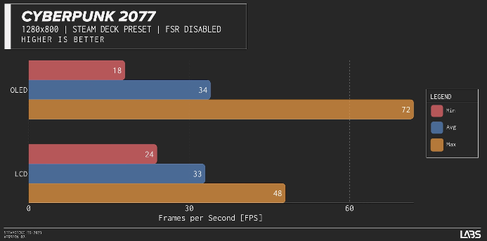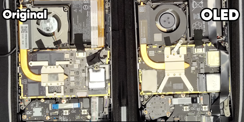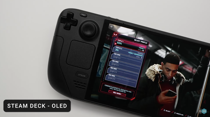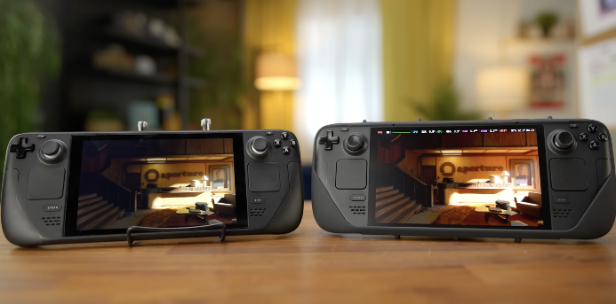 Steam Deck OLED 亮度测试. 图片来自:youtube.com/@LinusTechTips高动态范围的好处是能最大程度地显示明暗关系,光这一点就拯救了前一代 LCD 屏幕发灰的问题,高饱和度也能让眼睛在弱光环境下的舒适感提升。Steam Deck OLED 显示对比. 图片来自:youtube.com/@LinusTechTips色彩是游戏「沉浸感」的重要来源,不然再好的声效和剧情,也无法阻止大灰屏将我们从体验中抽离出来。目前刷新最高能够达到 90Hz ,比起先前的 60Hz进步了不少,不过有些可惜,不能设置可变刷新率。Steam Deck OLED 帧率测试. 图片来自:youtube.com/@LinusTechTips根据 Youtube 博主 Linus 的测试,游戏运行时的帧率表现,总的来说和上一代几乎持平,不过最大帧率的表现,OLED 版本都会略胜一筹,当然这也是应该的。不过在「赛博朋克 2077」 的跑帧中,OLED 屏的最小帧率竟然比 LCD 屏的差了 6 帧,已入手玩家为数不多的安慰点,终于找到了一个。Steam Deck OLED 游戏测试. 图片来自:youtube.com/@LinusTechTips另外一个惊喜是新机的屏幕变大了,从 7.0 英寸升级到 7.4 英寸,更让人高兴的是,大屏不是通过增加设备尺寸实现的,而是缩小黑边,一举两得、一箭双雕了属于是。Steam Deck OLED 宣传图. 图片来自:youtube.com/@LinusTechTips游戏掌机的迭代速度在电子产品领域普遍偏慢,任何一台掌机的上线都会成为这家公司今后若干年的终端代表,也会陪伴玩家很多年。在这期间,通过性能整体不变、体验略有提升的「半代升级」是行业里的常用策略,稳定用户群体的同时也能减小产品更新的风险。PS5 Slim 就采用了这样的路线,主机性能不变但体积和重量都变小了很多,将更多嫌 PS5 「大」的潜在用户作为了新品的目标,而老玩家们的权益,也得到了保障。PS5 & PS5 Slim. 图片来自:sonySwitch 如此,Steam Deck OLED 亦然。「0.4 英寸 ﹢ OLED」是新款 Deck 小心前行中的大胆试探,也是一个值得这个价格的半代升级掌机,当然如果我们按照以往的行业规律,这次更新也预示着 Steam Deck OLED 在短期内,大概率不会推出下一代产品了。除了黑边,外观上最明显的变化还有两处,一是实体按钮的图案和遥感底座的颜色有了细微变化,二是电源键按钮成了鲜艳且显眼的橙色。Steam Deck OLED 电源按钮. 图片来自:youtube.com/@LinusTechTips你不玩儿的时候,鲜艳的橙色在呼唤你;你玩儿得太久的时候,显眼的橙色在警告你。但如果你不去注意这些细节,只是大体比较两个机器的外观,可以说完全没有差别,因为连上一代的保护壳都能严丝合缝地装在新机器上。Steam Deck OLED 顶部布局. 图片来自:youtube.com/@LinusTechTips已经买了的不亏,壳子还能接着用。如果你还有上一代剩下没用的屏幕贴膜,那恭喜你这个也能接着用。变大的屏幕还有另一个升级 —— 变薄了,这就给它背后的电池留有更多的扩容空间。