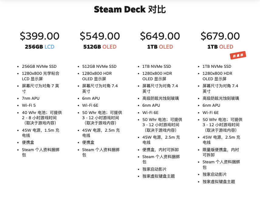 Steam Deck OLED 限量版. 图片来自:steamdeck.com$549 的起售价并不美丽,但如果不是掌机游戏的重度爱好者,又想尝试一下新玩具,那老款 LCD 版本的 Deck 依然在售,$399 的基础版本更有性价比,也能有不俗的游戏体验。Steam Deck 是个很神奇的产品,刚问世的时候全网断货,就连黄牛加价一万都会有人为它买单。色差、发烫等的小毛病一直存在,不知道新版的优化会不会达到玩家们的期望。![]()