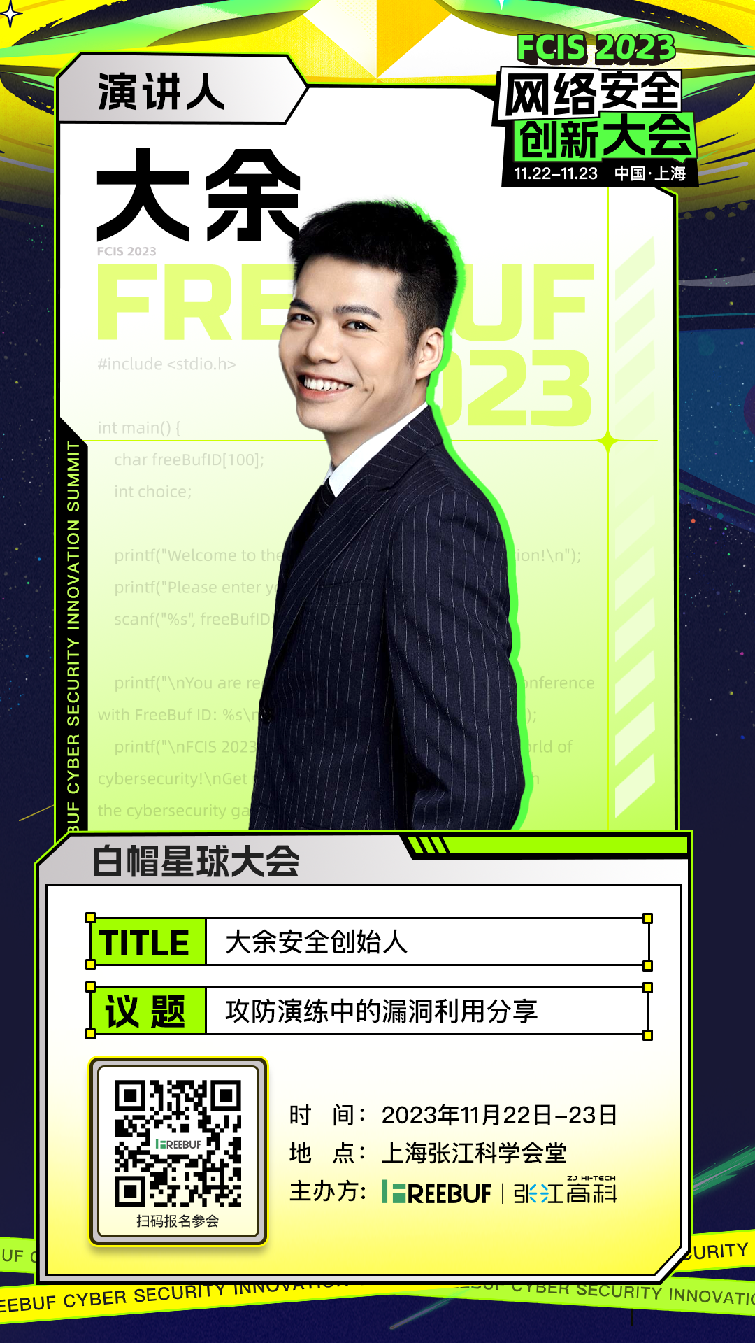 在 11 月 22 日举办的 FCIS 2023 网络安全创新大会 (以下简称“FCIS 2023大会”) 白帽星球大会现场,大余安全创始人大余、自由安全研究员伍智波(SkyMine),将围绕攻防演练中的漏洞利用及红队反溯源,就其中的技术经验和独特见解与大家进行讲解交流。