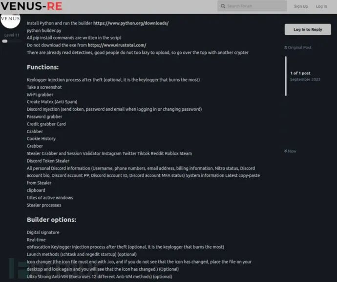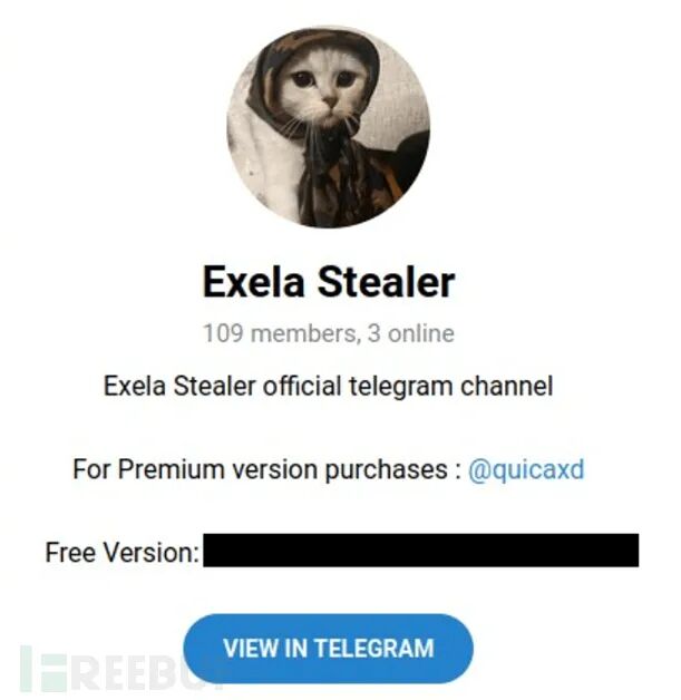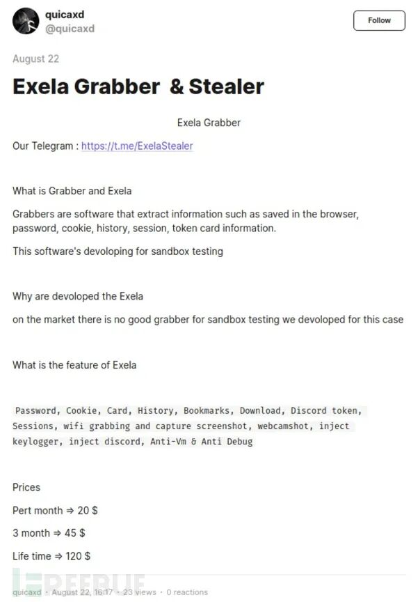 ExelaStealer 在暗网宣传的广告中表示,攻击者提供开源版本与付费版本,广告也对功能进行了深入介绍:广告由 ExelaStealer 的运营方发布,账号是 quicaxd:如上所示,该恶意软件一个月的使用费为 20 美元,三个月的使用费为 45 美元,终身订阅费为 120 美元。此外,攻击者还提供了 Telegram 频道,分析时仍处于活动状态。Telegram 主页介绍了购买的付费版本,与开源版本的 GitHub 仓库地址。 恶意软件构建