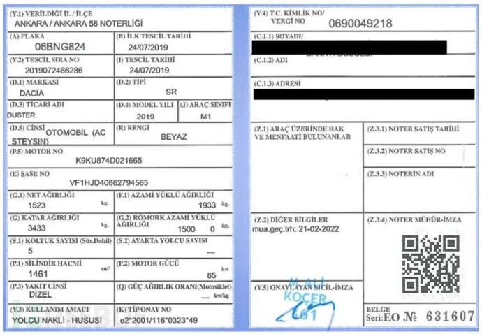 sirket-ruhsat-pdf.exe 会自动尝试打开 BNG 824 ruhsat.pdf 文件,该 PDF 文件是 Dacia Duster 的土耳其车辆登记证书,文档本身完全无害,只是对受害者的诱饵。Sirket-ruhsat-pdf.exe