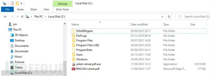 该二进制文件是最初阶段使用的,旨在生成 sirket-ruhsat-pdf.exe 并启动 PDF 查看软件并向用户显示诱饵文档 BNG 824 ruhsat.pdf。后续,会将这两个文件写入 C 盘的根目录中:BNG 824 ruhsat.pdf