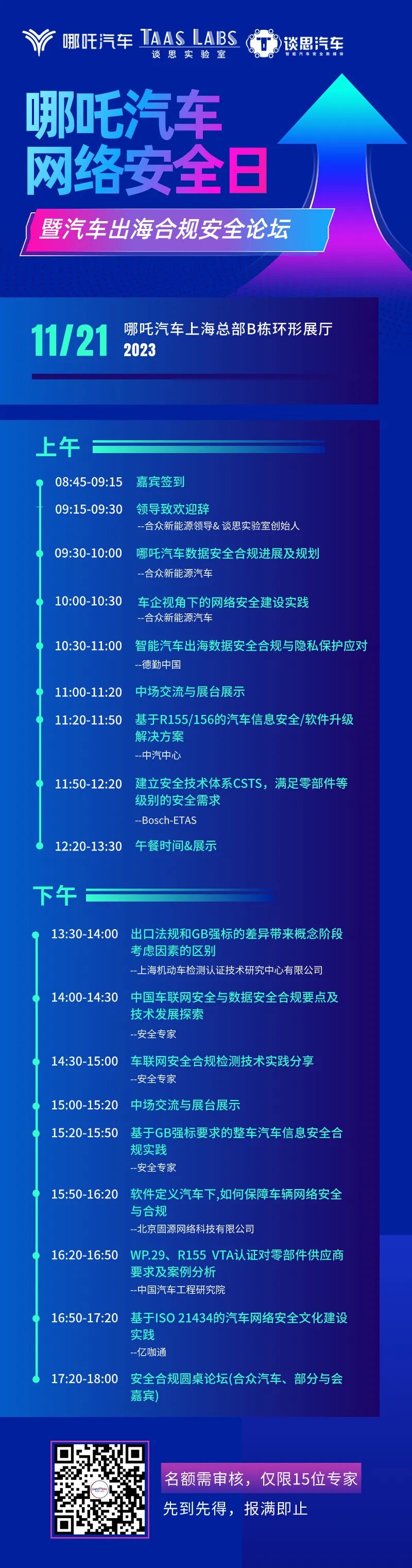 基于以上行业的呼声以及哪吒汽车在安全方面的探索实践, 哪吒汽车将联合谈思实验室计 划于 2023 年 11 月 21 日共同主办“哪吒汽车安全日暨汽车出海合规安全论坛”活动, 本次活动将邀请安全行业头部专家与各供应商伙伴开展安全技术交流 ,本次论坛分享主题涵盖了汽车出海安全合规、安全研发解决方案、安全测试等各方面内容(论坛主题具体详见议程)。