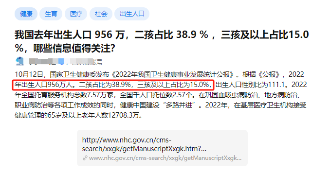 前阵子提到了2022年出生人口,按照国家卫生健康委的《公报》显示,2022年出生人口956万人,其中二孩占比为38.9%,三孩及以上占比为15.0%,普遍的看法是中国正式进入了漫长的人口下行通道。