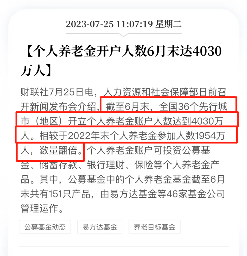 事实也证明现代人的养老意识被逐渐唤醒,据统计,2023年6月末个人养老金开户人数为4030万人,相较于2022年末的1954万实现了数量翻倍。