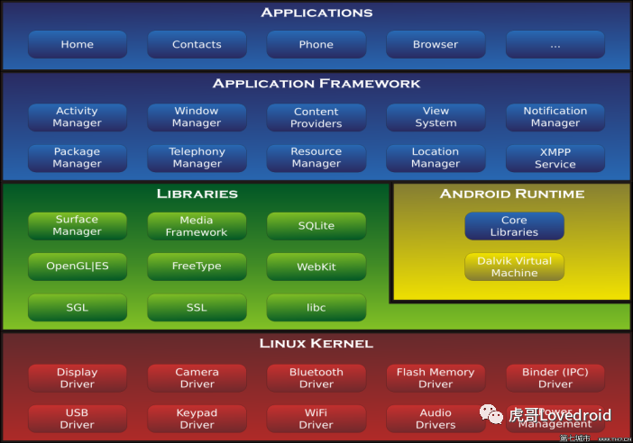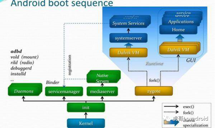 上图是Android系统启动流程图,具体说明如下:Android系统运行于Linux内核之上,init进程是用户空间启动的第一个进程,职责主要为fork出系统关键进(Daemons)、servicemanager、zygote等;提供属性服务管理系统属性等。Zygote由init进程根据init.rc文件配置项创建,Zygote是一个虚拟机进程,同时也是一个虚拟机孵化器。负责虚拟机初始化、预置库的加载及初始化等。每当系统要求执行一个Android应用程序时,Zygote就会创建一个进程来执行该应用程序。SystemSever是Zygote第一个子进程,由Zygote进程孵化出来,作为Android框架的核心,主要负责Android系统初始化并启动其他服务运行于该进程空间。