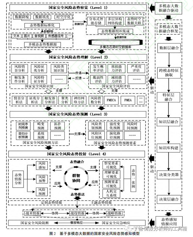 (1)多模态态势数据获取子模块。多模态大数据中蕴含着国家安全风险演变的全过程,对其进行有效获取是确保复杂环境下态势感知科学性和准确性的关键,也是消除决策过程中信息不完备问题的基础。依据我国《国家情报法》,结合国家安全情报相关实践,可将国家安全情报数据来源分为:国家情报工作机构数据、国家安全相关机构数据、开源情报数据、互联网企业数据等。上述数据涵盖文本、图片、音频、视频、传感器信号等多种模态,对其进行有效获取十分关键。在国家安全情报实践中,鉴于各类情报数据间存在“流通壁垒冶问题,因此需要通过明确共享任务、构建协作机制等措施推进数据共享融合的进程,并在此基础上运用开放数据接口,部署数据探针等方式推动多模态大数据的有效获取,为后续流程奠定基础。