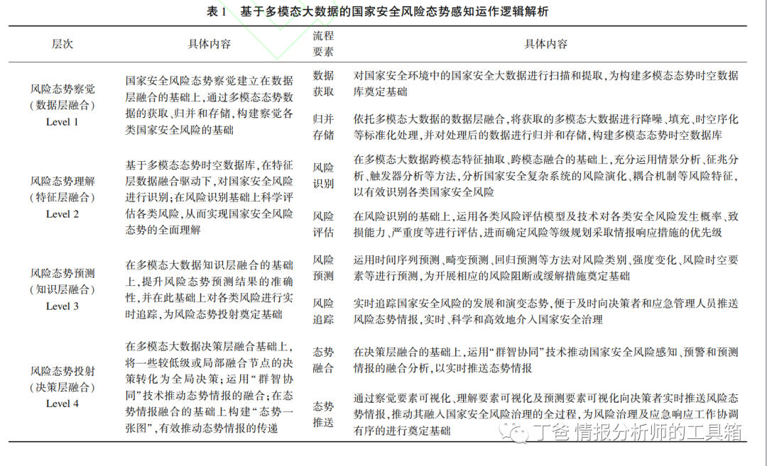 上述运作逻辑实质上是一个推动多模态大数据由低层次向高层次转变的过程,通过多模态大数据的数据层寅特征层寅知识层寅决策层融合,驱动国家安全风险态势察觉寅风险态势理解寅风险态势预测寅风险态势投射的有序运行。从整个国家安全风险态势感知的运作逻辑上看,只有在多模态大数据有效融合的基础上,通过风险态势察觉,获得必要的情报数据,并在此基础上推动风险态势的理解及预测,进而实现风险态势情报的应用,才能使得国家安全风险态势感知能力真正落地。在下文中,我们将对多模态大数据驱动下的国家安全风险态势感知模型进行构建,为推动该模型更好的融入国家安全情报实践奠定基础。