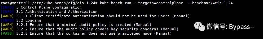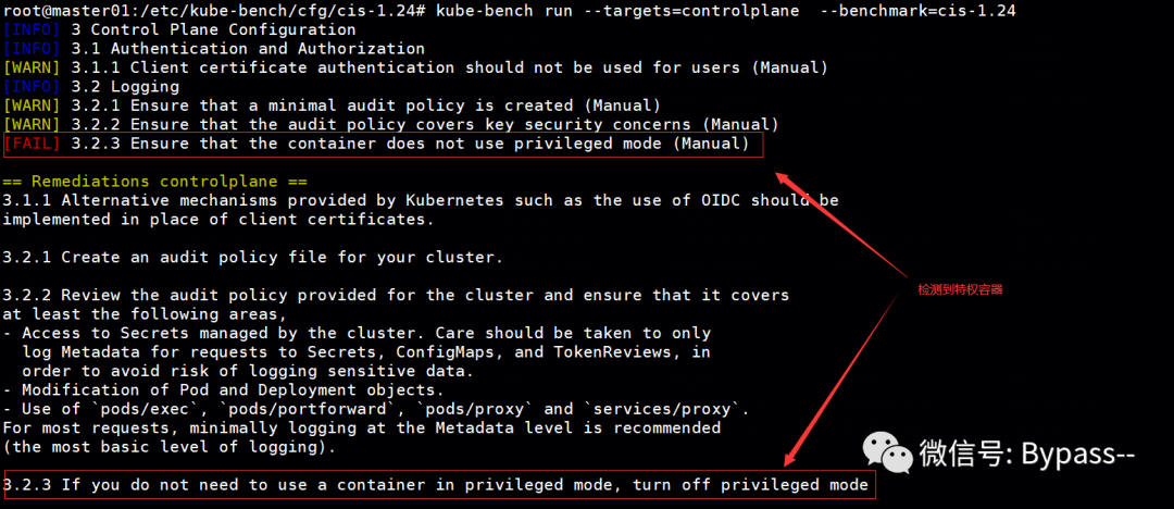 root@master01:/etc/kube-bench/cfg/cis-1.24# vi controlplane.yaml- id: 3.2.3text: "Ensure that the container does not use privileged mode (Manual)"audit: "if test -z $(kubectl get pods --all-namespaces -o jsonpath='{.items[*].spec.containers[?(@.securityContext.privileged==true)].name}'|sed 's/calico-node//g'|sed 's/kube-proxy//g');then echo ok;else echo err;fi;"tests:test_items:- flag: "ok"remediation: "If you do not need to use a container in privileged mode, turn off privileged mode"scored: true