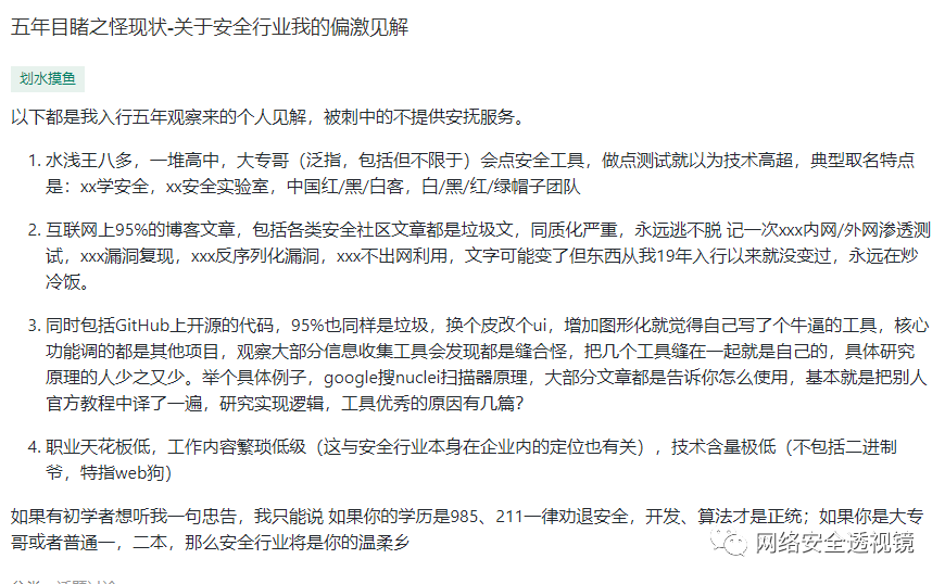 话说的虽然难听,但也真实,对于计算机行业来说 开发,算法或是正统。但无论开发还是算法亦或是安全,也还是要不断的学习提升自己。反思我最近两个个月,天天更新公众号,我又得到了什么?无非是焦虑的时候,迷茫的时候,给自己找点事做,但自己毫无提升。似乎也理解了为什么最初关注的那些安全大佬们也不再更新文章,甚至朋友圈都很少发了。