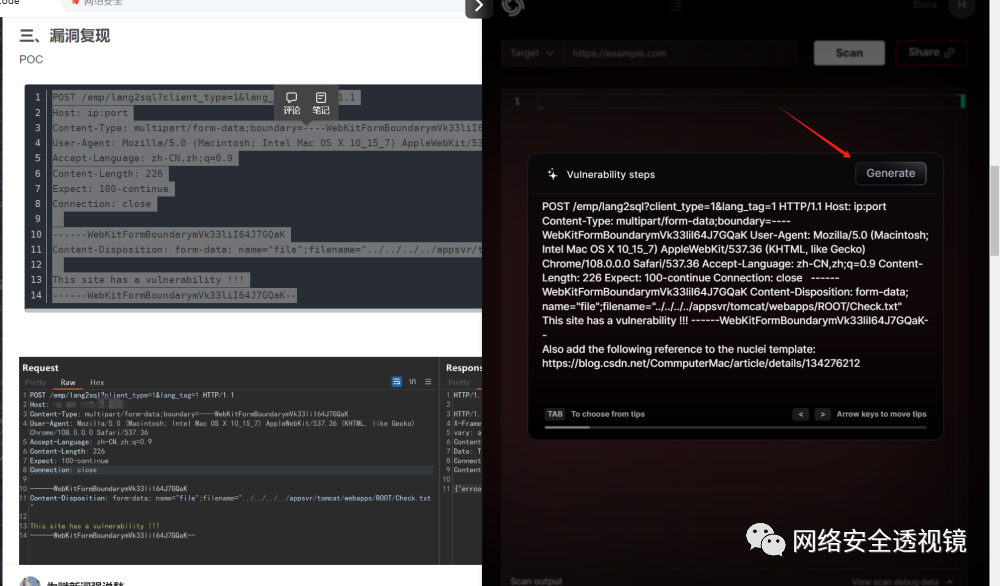 打开网页,找到POC,选中POC,然后右击,点击Generate Nuclei Template,右边会弹出一个框框,点击Generate,稍等一会即可生成Nuclei POC。(需要翻墙连外网)