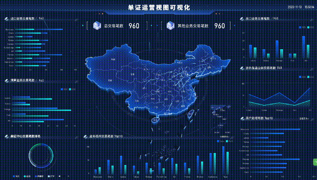 从上述案例中,我们可以注意到大屏可视化色彩设计有两个明显的特点:1、行业相关联的颜色主题;2、图元渐变着色。