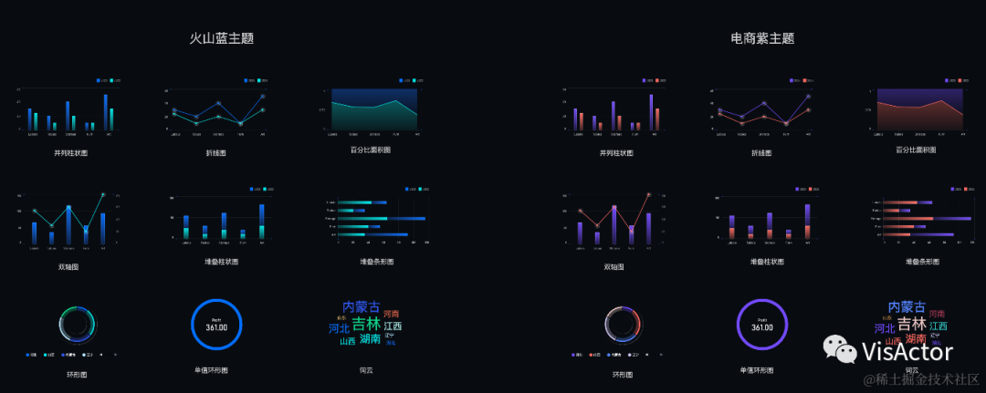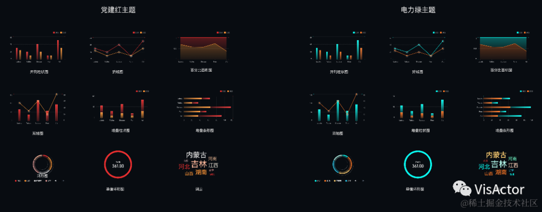 主题色板的构造基于于语义化及美观设计原则,即结合使用场景(保证大屏主题的场景表现力)、配色公式(保证图元在美观度、差异度等方面的配色效果和信息表达力)等逻辑进行设计。而针对大屏业务场景,我们沉淀出一套色彩方案,涵盖党建、金融、科技、文旅等行业,结合 VChart 主题注册和切换能力,做到开箱即用。