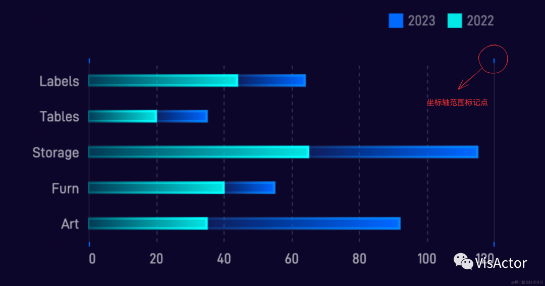 为了标记出坐标轴的覆盖范围,我们需要增加轴辅助装饰。用VChart的轴tick回调函数可以实现这一效果。实现原理是,根据回调中的index判断tick是否是第一个或最后一个,如果是的话则设置为可见,不是的话则隐藏。