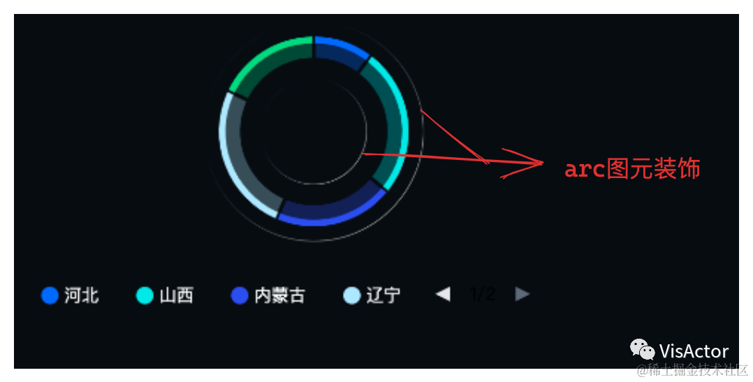 由于装饰的位置强依赖于图元,在大屏侧无法准确定位并添加。通过VChart提供拓展Mark配置能力可以直接渲染出依附于既有图元的装饰图元,完美解决这一问题。