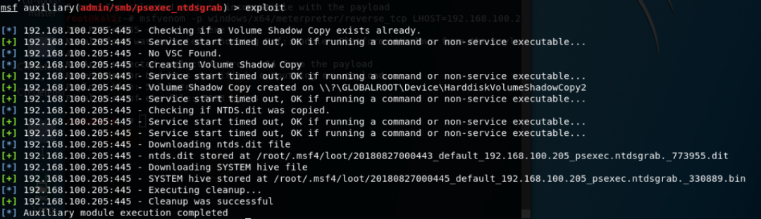 该小节包括两种方法,第一种方法是使用psexec辅助获取域控制器的ntds.dit进而获得域账号和域Hash,第二种方法是使用现有Meterpreter进行后渗透,在已有域控制器Meterpreter会话的前提下完成的。