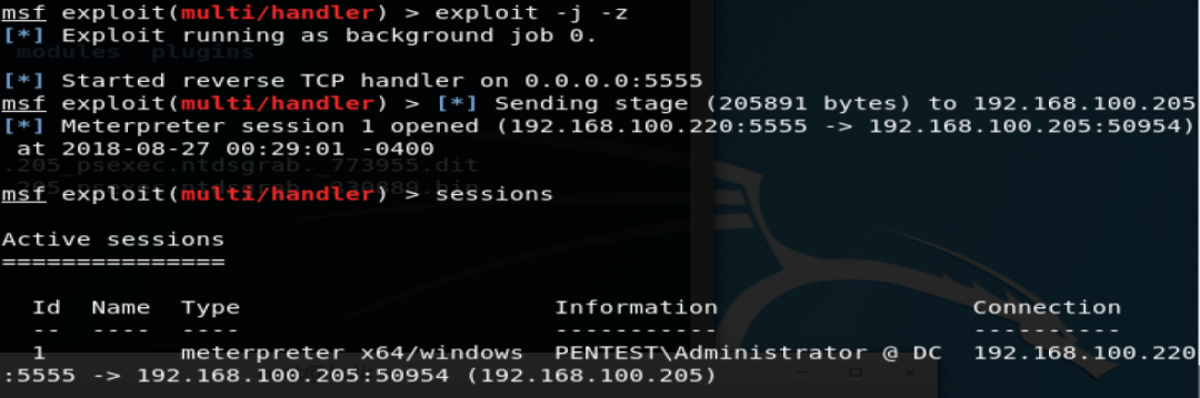 在msf下输入sessions可以查看当前存在的Meterpreter会话,可以看到现在有一个id为1的Meterpreter会话,ip为192.168.100.220,机器名为DC,正是我们的域控制器。