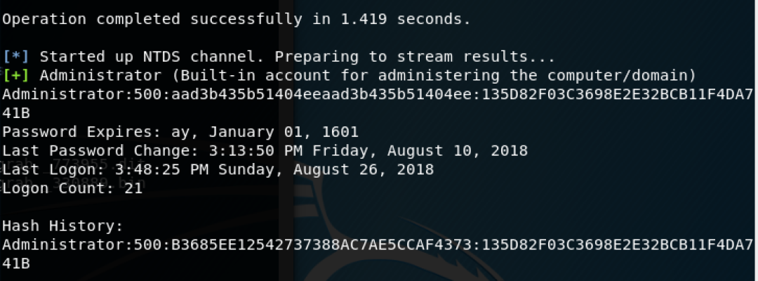 执行完毕后可以看到,ntds.dit被成功解析,域账号和域Hash导出成功,如图6-43所示。