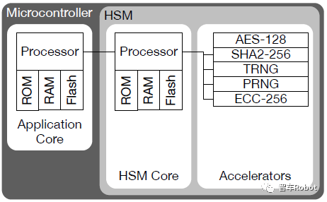 几家领先的芯片制造商已经提供了一些具有汽车级架构的HSM解决方案,这些方案通常包括微控制器处理器、不同用途的内存块(如RAM、ROM、闪存)、用于哈希函数、对称和不对称密码操作的硬件加速器,以及HSM与ECU内的主机处理器之间的安全接口。在ECU内,通常使用HSM中的硬件加速器进行依赖于密钥的密码操作。HSM不仅将秘密信息(如密钥)保存在一个可信的硬件环境中,而且还通过专用硬件加速为密码操作提供良好的加速效果。