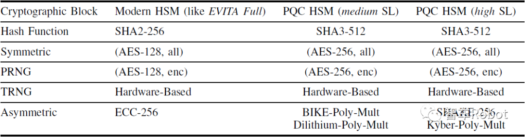在后量子安全的HSM(PQC HSM)中,哈希函数和对称密码原语的选择都旨在保持128位的安全性,以抵御量子计算机对中高安全级别的攻击,从而更加保守。对于非对称密码原语,需要更激进的变化:与现代HSM相比,构建PQC HSM需要完全不同的加密块。表1和图2分别总结了针对中高安全级别提出的HSM解决方案。