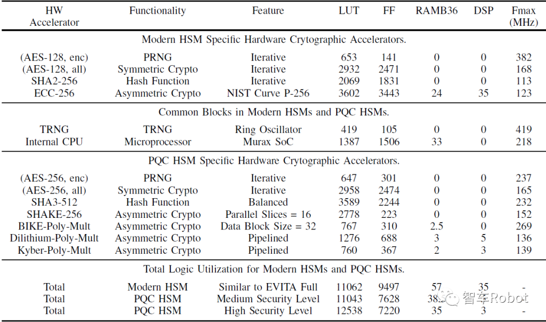 如表2所示,三种HSM配置的总区域使用情况:现代HSM、中等安全级别的PQC HSM和高安全级别的PQC HSM。与现代HSM相比,中等安全级别的PQC HSM实现了类似的区域利用率,而对于针对高安全级别的PQC HSM,在区域使用方面引入了较小的开销,例如在LUT使用方面,有大约13%的开销。从表中可以看出,在内存和DSP利用率方面,两种PQC HSM配置实际上都更轻量级,因为ECC-256非对称加密核心这种对内存和DSP密集型的组件被从HSM架构中移除了。