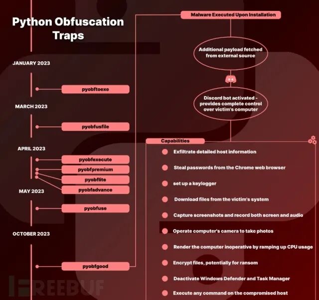 安全公司Checkmarx报告称,自今年1月以来,共有八个不同的开发工具中包含隐藏的恶意负载。最近一个是上个月发布的名为"pyobfgood"的工具。与之前的七个软件包一样,pyobfgood伪装成一款合法的混淆工具,开发人员可以使用它来防止代码的逆向工程和篡改。一旦执行,它会安装一个恶意负载,使攻击者几乎完全控制开发人员的机器。- 通过增加CPU使用率、在启动目录中插入批处理脚本以关闭计算机,或者使用Python脚本强制出现BSOD错误来使计算机无法使用- 禁用Windows Defender和任务管理器