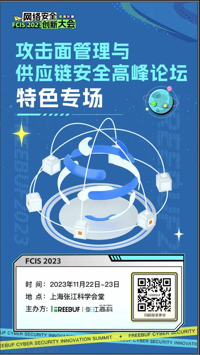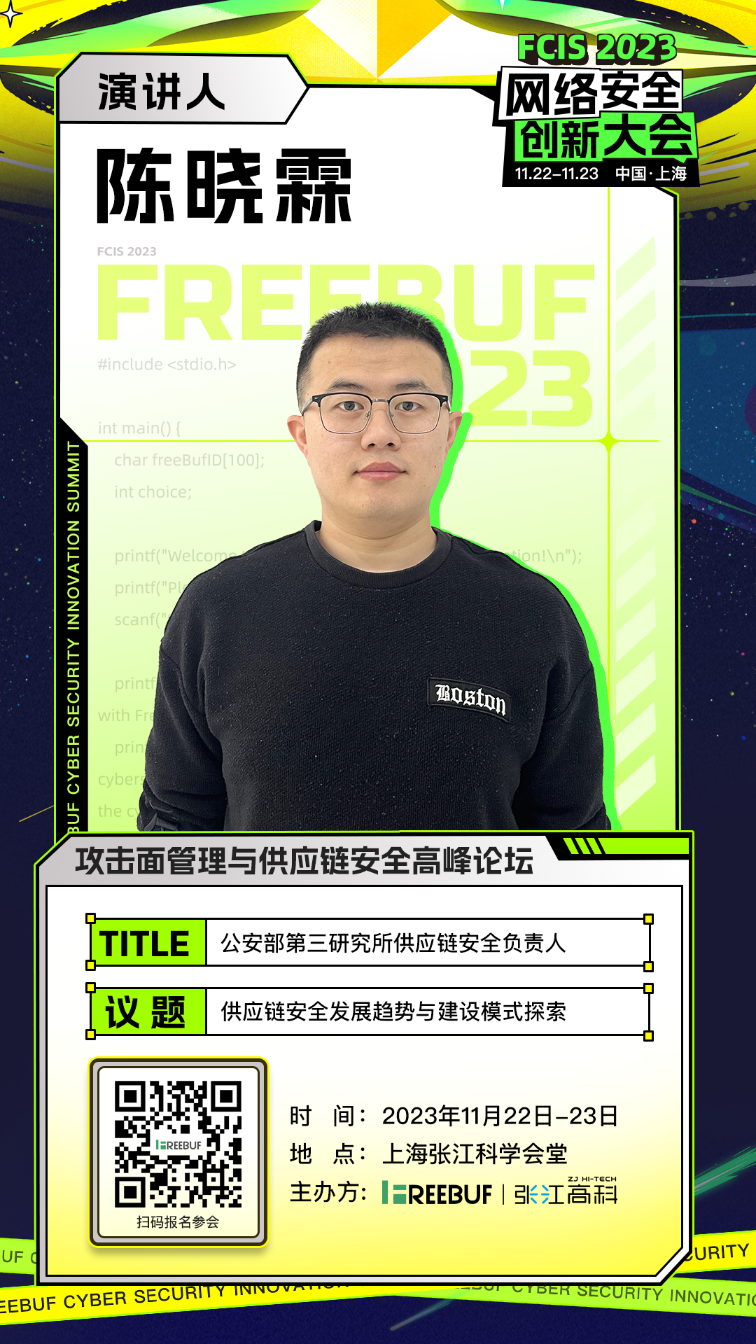在 11 月 23 日举办的 FCIS 2023 网络安全创新大会——攻击面管理与供应链安全高峰论坛上,来自公安部第三研究所供应链安全负责人陈晓霖,将围绕【供应链安全发展趋势与建设模式探索】这一议题,从供应链未来发展模式、应对措施等角度出发,与现场观众共同讨论供应链安全在企业安全中的实践。