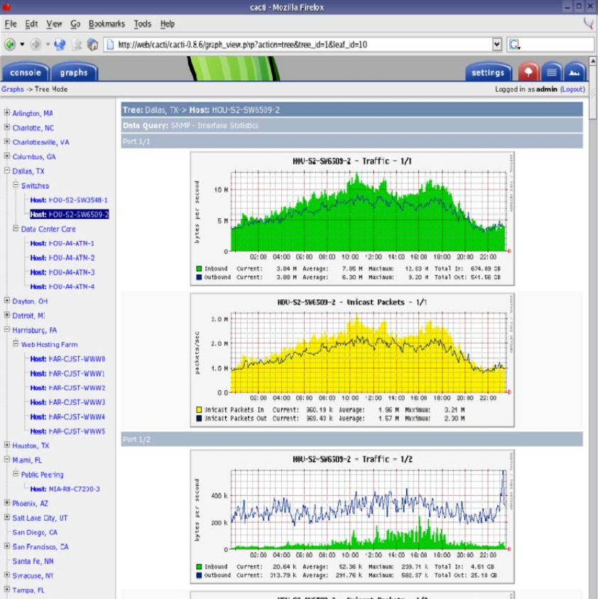 它通过 snmpget 来获取数据,使用 RRDtool 绘图,但使用者无须了解 RRDtool 复杂的参数。它提供了非常强大的数据和用户管理功能,可以指定每一个用户能查看树状结构、主机设备以及任何一张图,还可以与 LDAP 结合进行用户认证,同时也能自定义模板,在历史数据的展示监控方面,其功能相当不错。