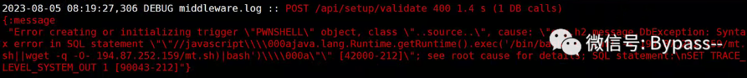 (1)使用docker logs查看容器日志,并通过异常信息定义到漏洞触发的位置。如下图:通过POST提交请求,使用wget和curl命令下载挖矿脚本并执行。