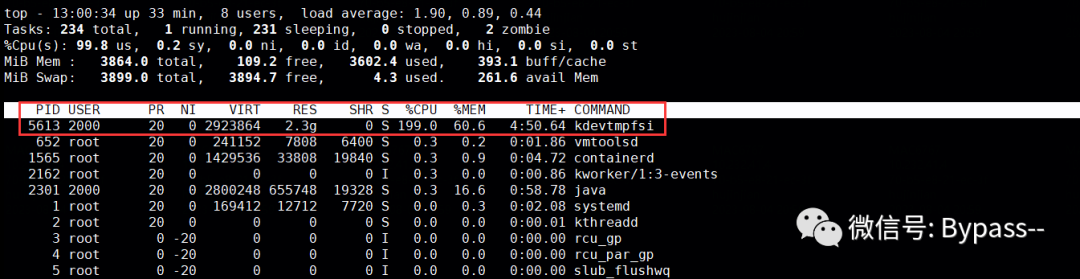 (4)使用docker top 查看容器中的进程信息,找到到容器内异常进程。如下图:异常进程kdevtmpfsi(PID:5613)对应的父进程为JAVA进程(PID:2301)。据此,可初步判断,java应用被入侵,导致容器被植入挖矿木马。