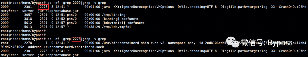 (2)通过进程PID和USER查看进程信息,通过进程链定位到进程所在容器的进程PID。