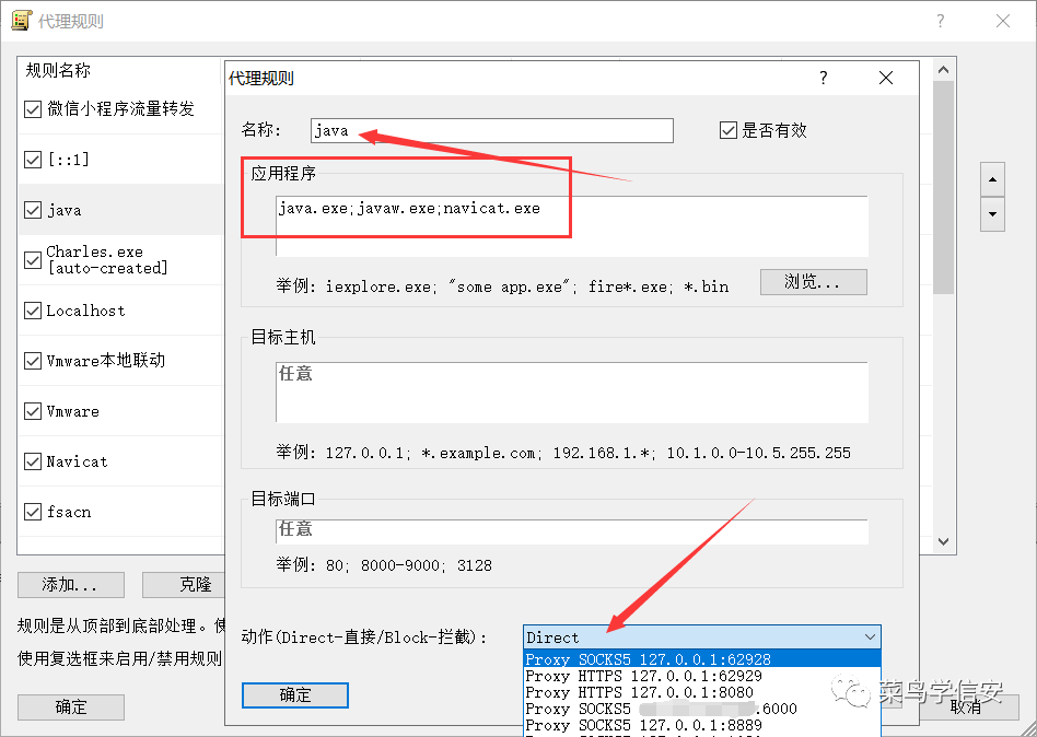 特别注意:Burp是通过java启动的,那上面配置的java相关的规则要选择 Direct (直接连接,即不走任何代理),否则两者会冲突!!!
