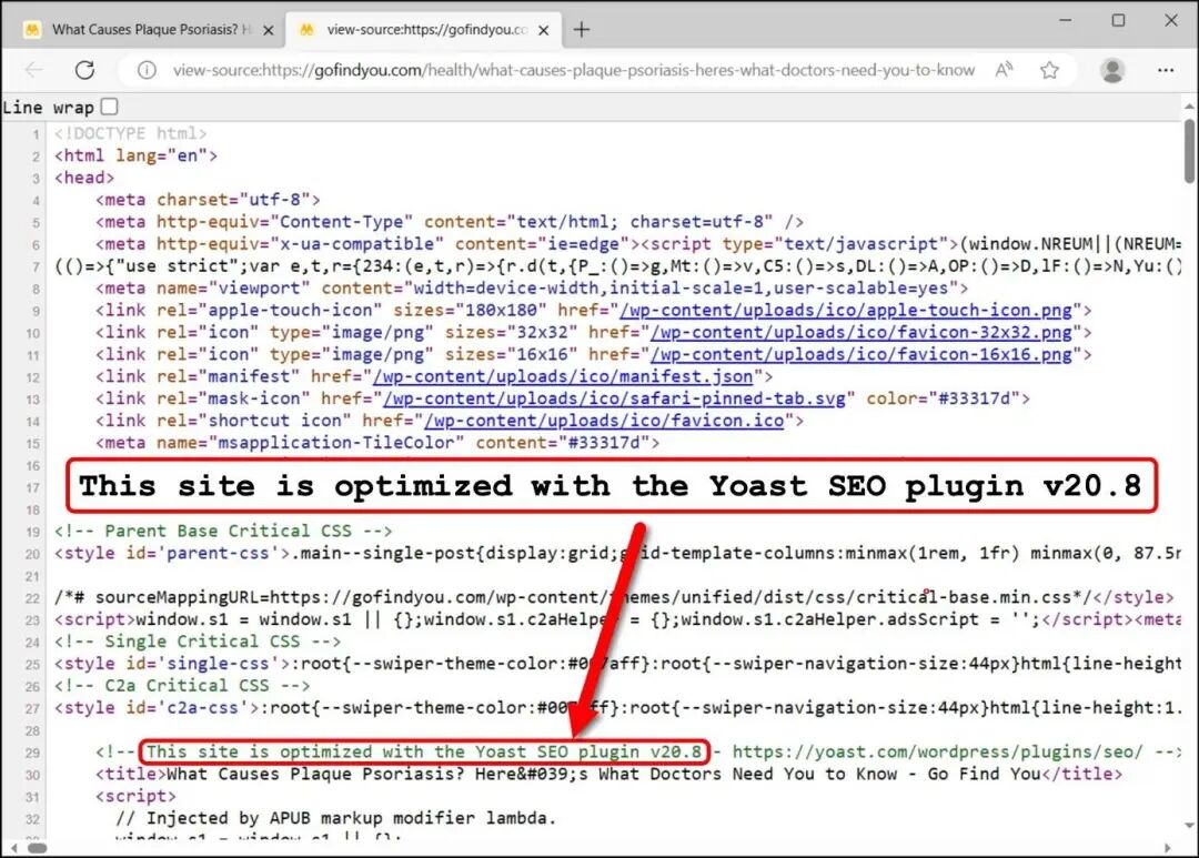 在上图中,研究人员添加了一个红色箭头,指向hxxps://gofindyou[.]com/health/what-causes-plaque-psoriasis-heres-what-doctors-need-you-to-know的标题党内容,快速检查发现这个网站至少运行了一个过时的软件。来自网页的HTML代码表明它使用了用于Yoast SEO的WordPress插件,如下图所示: