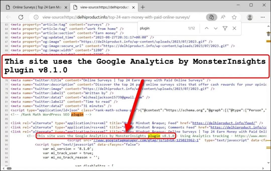 一个示例是在 hxxps://delhiproduct[.]info/top-24-earn-money-with-paid-online-surveys 上用ChatGPT写的一篇文章,在本例中,该网站是一个运行MonsterInsights插件(版本8.1.0)的过时版本的WordPress网站,如下图所示: