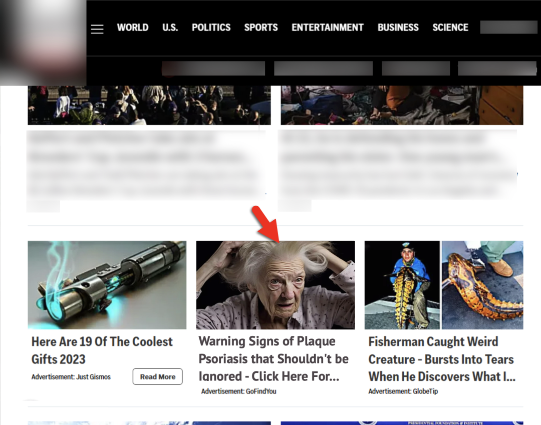 内容发现平台经常使用技术来伪装广告。其中一种方法被称为原生广告,此方法将广告内容配置为与其所在网站的外观相似,浏览者很难区分网站的原创内容和广告内容。下图显示了出现在新闻网站上的原生广告示例: