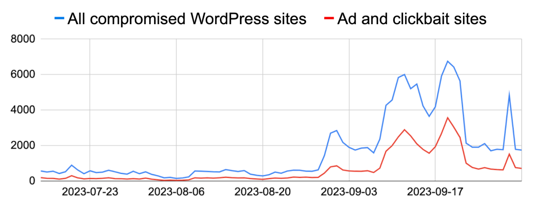 研究人员的数据证实了这一发现,分析发现与CVE-2023-3169相关的受攻击WordPress网站在2023年8月底开始激增。