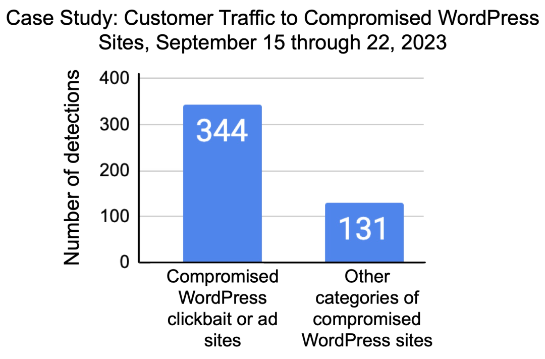 在2023年9月15日至22日的样本分析中,研究人员监控了1600个随机选择的WordPress网站的数据集,有用户试图访问受攻击的网站。