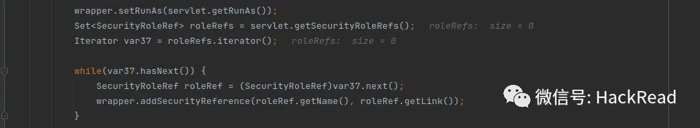 这里调用了Servlet的getServletName()方法,获取servlet的名字,也就是我们在主机中配置的name参数的值,接着将name的值设置给Wrapper。接着还将servlet.getRunAs()的结果传入给了Wrapper,不过因为此处servlet.getRunAs()的执行结果是null且roleRefs.size()==0,因此此处我们可以忽略: