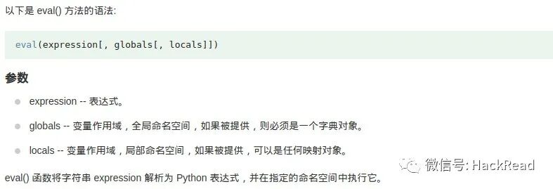 url_for是Flask的一个内置函数, 通过Flask内置函数可以调用其__globals__属性, 该特殊属性能够返回函数所在模块命名空间的所有变量, 其中包含了很多已经引入的modules,比如__builtins__模块。在__builtins__模块中, Python在启动时就直接为我们导入了很多内建函数,如eval,exec等。让我们看一下python中eval函数是怎样使用的: