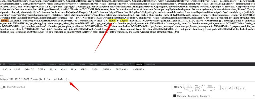 至此,整个payload的脉络也梳理清楚了。那仔细想想还有什么办法对这个payload进行一些改变呢?以request对象为例,刚刚提到,在payload中,获取request对象是通过从全局变量中获取_request_ctx_stack,并获取它的栈顶元素及请求上下文,而请求上下文的request属性即是我们的需要的request对象。但在我们其实可以在url_for.__globals__就找到此次请求的request对象,而不用通过这种方式来获取: